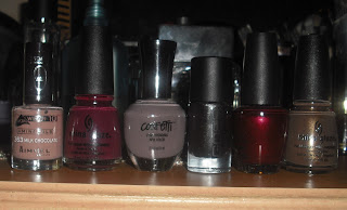 Armed with my list, here is what I pulled out of my train case...of course what nail polish junkie doesn't need a few new shades right? :) I`ll put new shade or old favorite next to each shade.